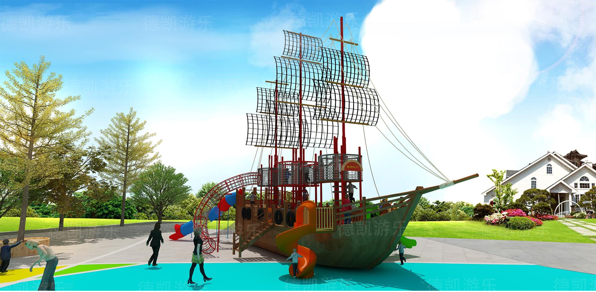 解析的是整個院子的主體設(shè)備:海盜船、秋千、異形爬網(wǎng)、蹦床、大鯨魚、探險鉆網(wǎng)、烽火臺鉆網(wǎng)、木制拓展組合。