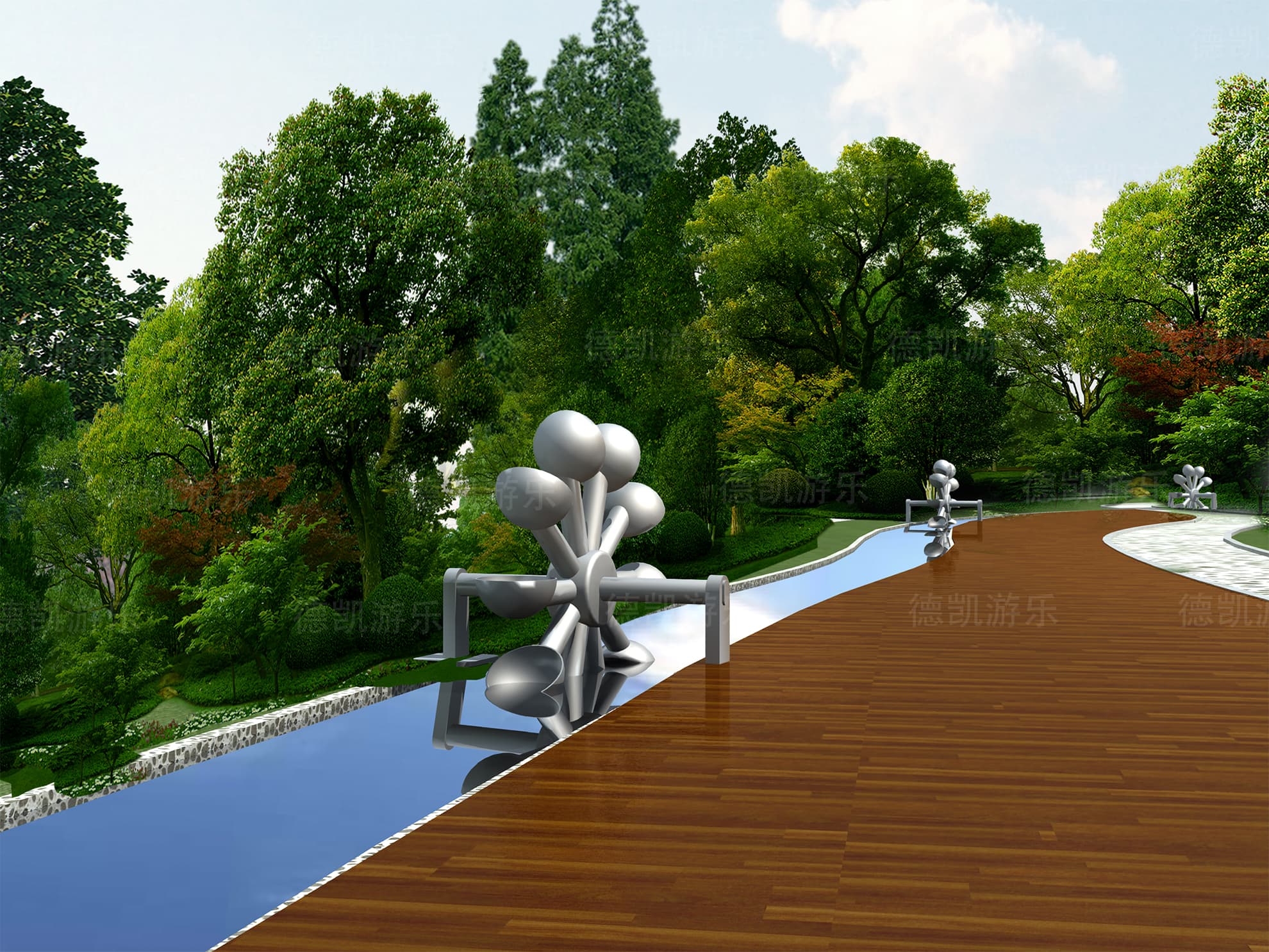 在這個角度看,整個項目完成后周圍環(huán)境就可以清晰的看見,因為主要修飾的是我們的設計部分,因此,設計區(qū)域的效果更好一些。彩虹門,水車又是激起孩子們探索興趣的寶貝,他們會歡快的穿過彩虹門,在小亭子休息一會會,趕緊又跑到又水車的地方,探索水車運轉(zhuǎn)的規(guī)律和樂趣。