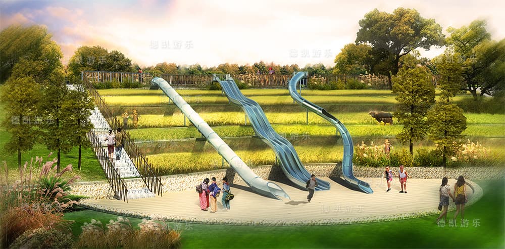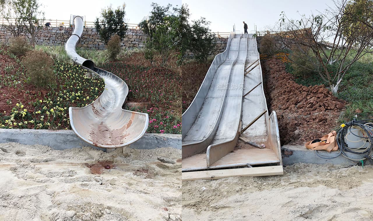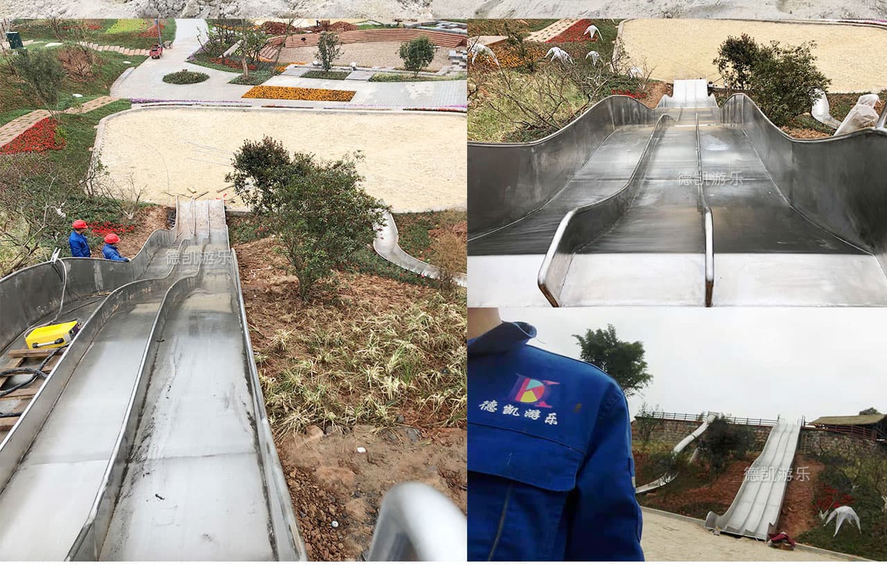 2018年9月四川德凱世界游樂設(shè)備有限公司與成都華僑城黃龍溪投資發(fā)展有限公司打造兩條20多米不銹鋼大滑道已完工。